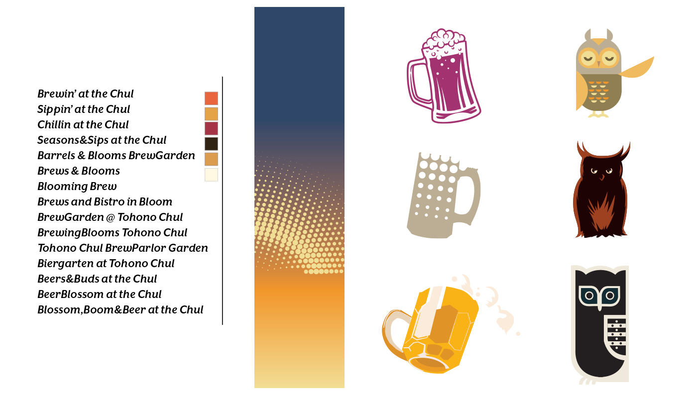 Research for the look and feel of 'Brewin at the Chul'. The colors reflects autumn tones, a harvest palette, the refreshing feel of lower desert temperatures, a celebration of a change of seasons, and the ability to enjoy evenings in a garden setting with live music and great drinks.