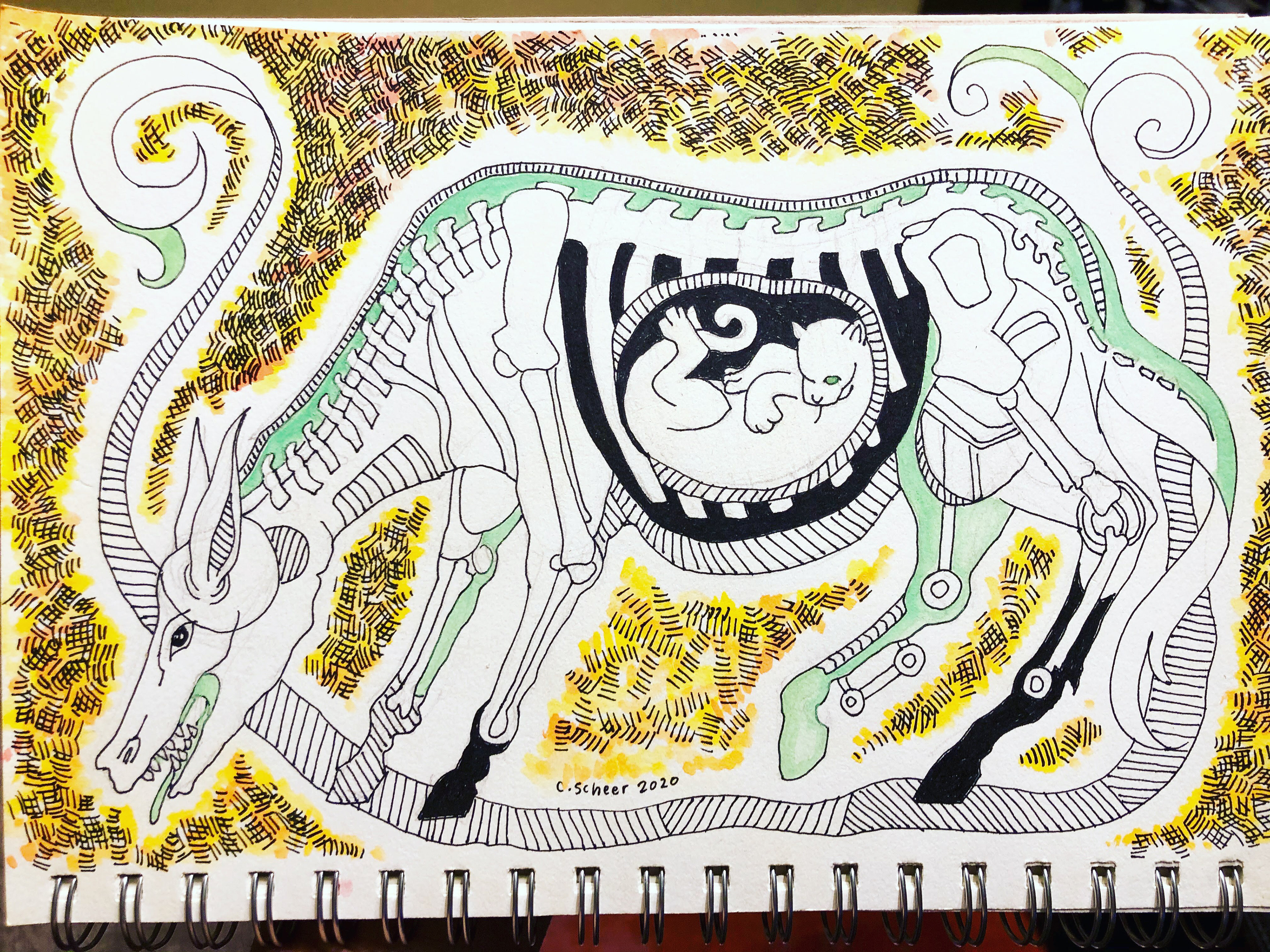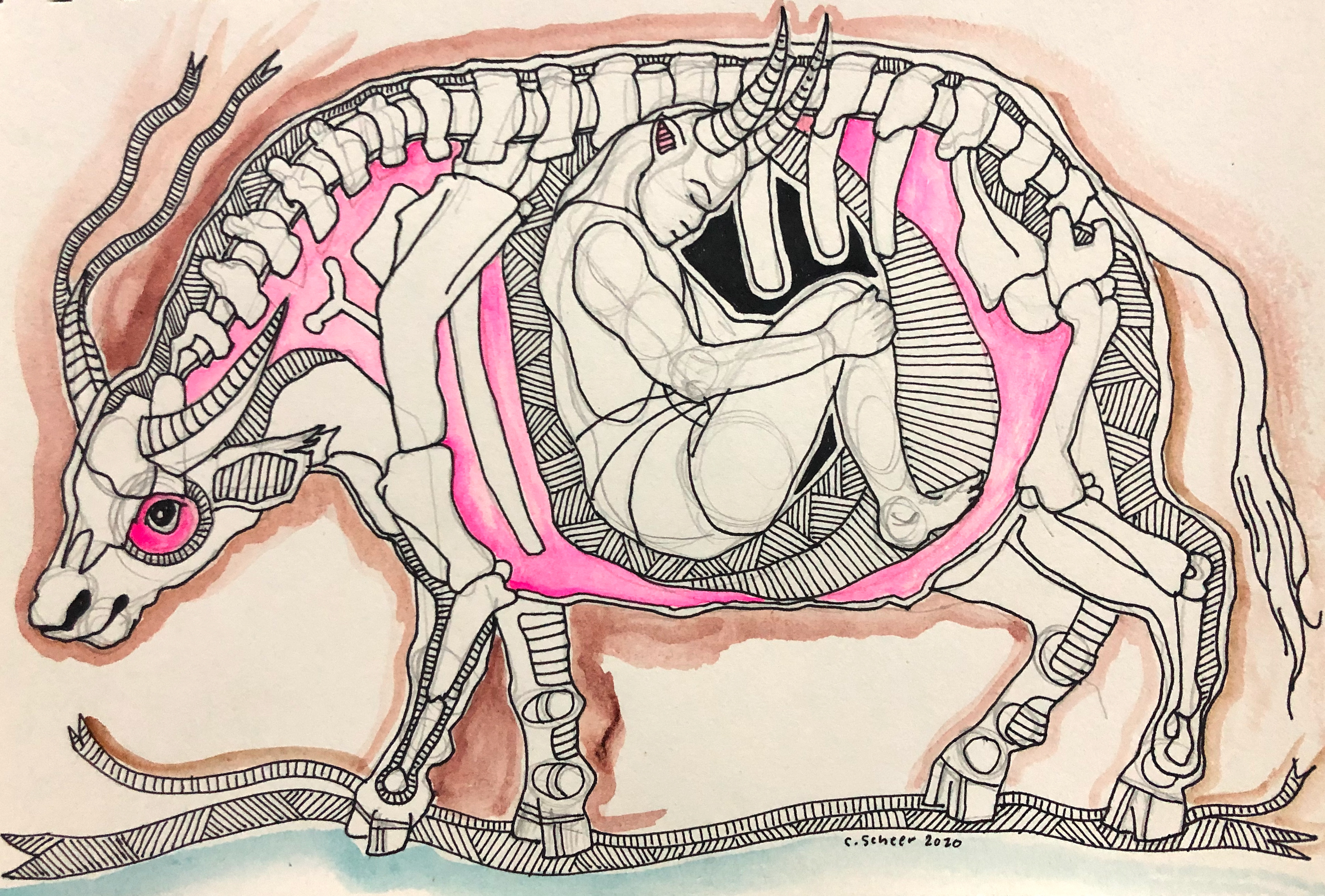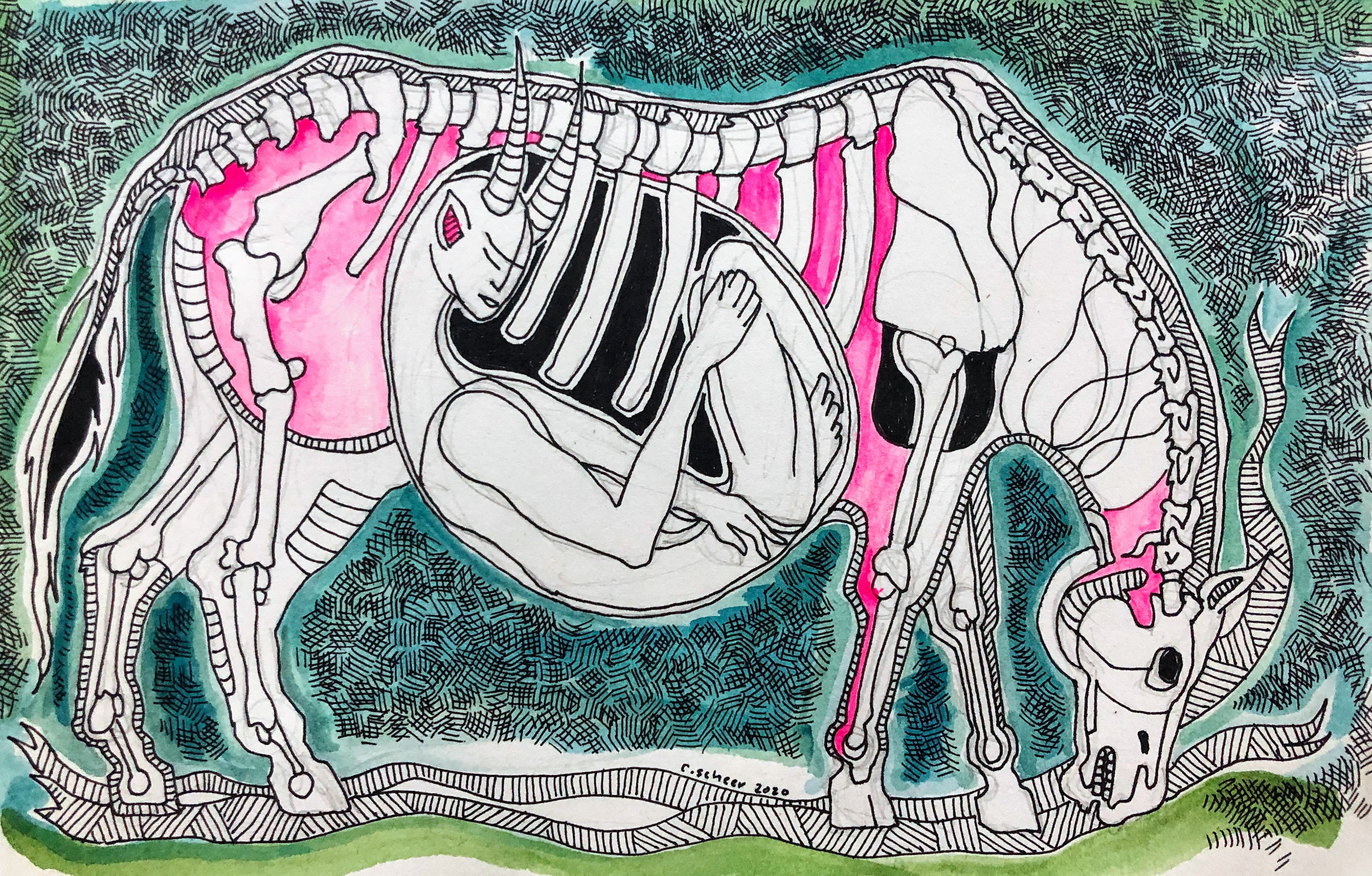 "Consumption" pen and watercolor sketches. At the beginning of COVID-19 pandemic, I was living in a small village in VietNam, and watching as the world quickly realized the potential of this global threat. The United States was bitterly against stay-at-home orders. These images are based on being 'asleep in the belly of the beast' which implies that perhaps, as a society, we are ignorant in the midst of a crisis.