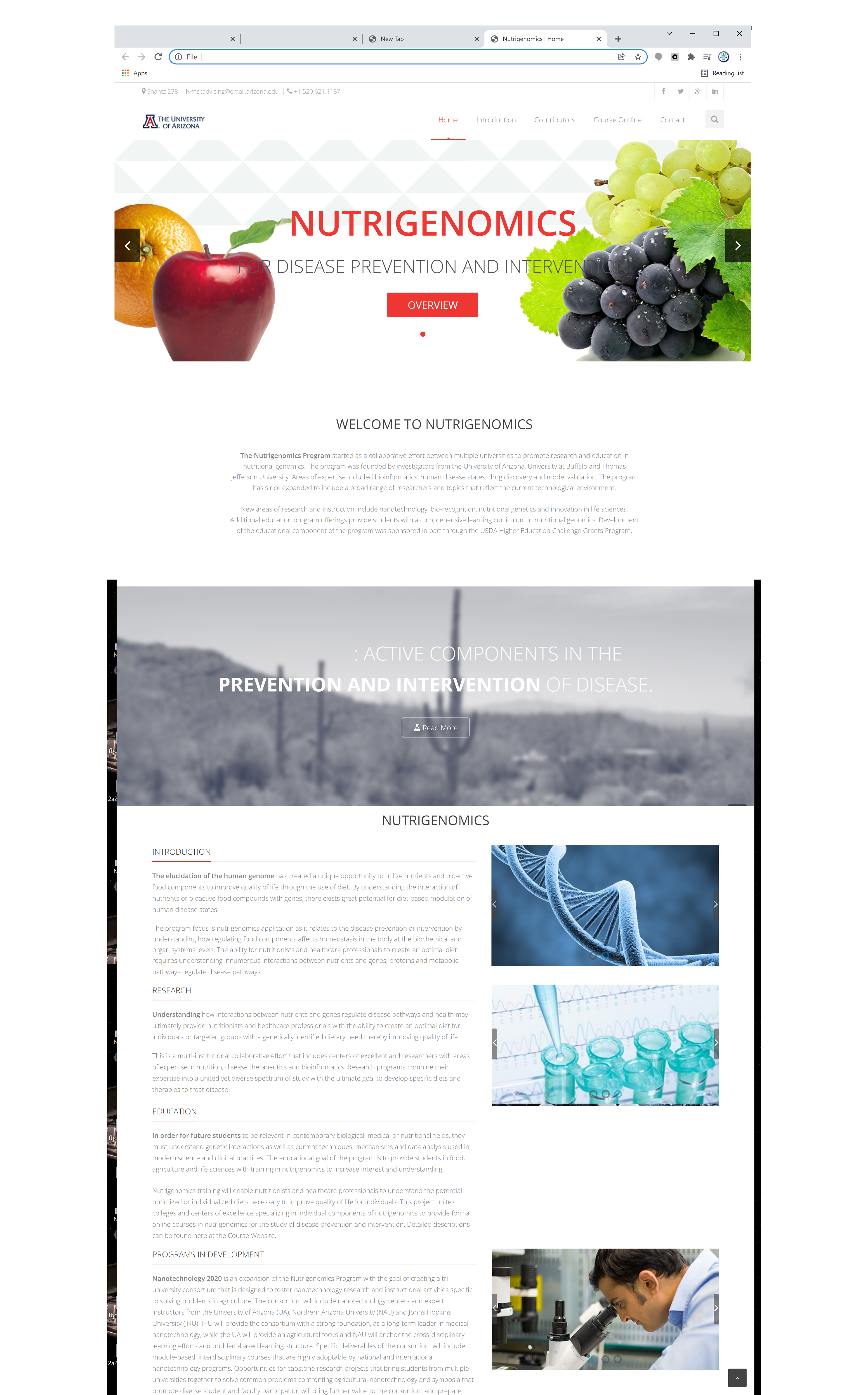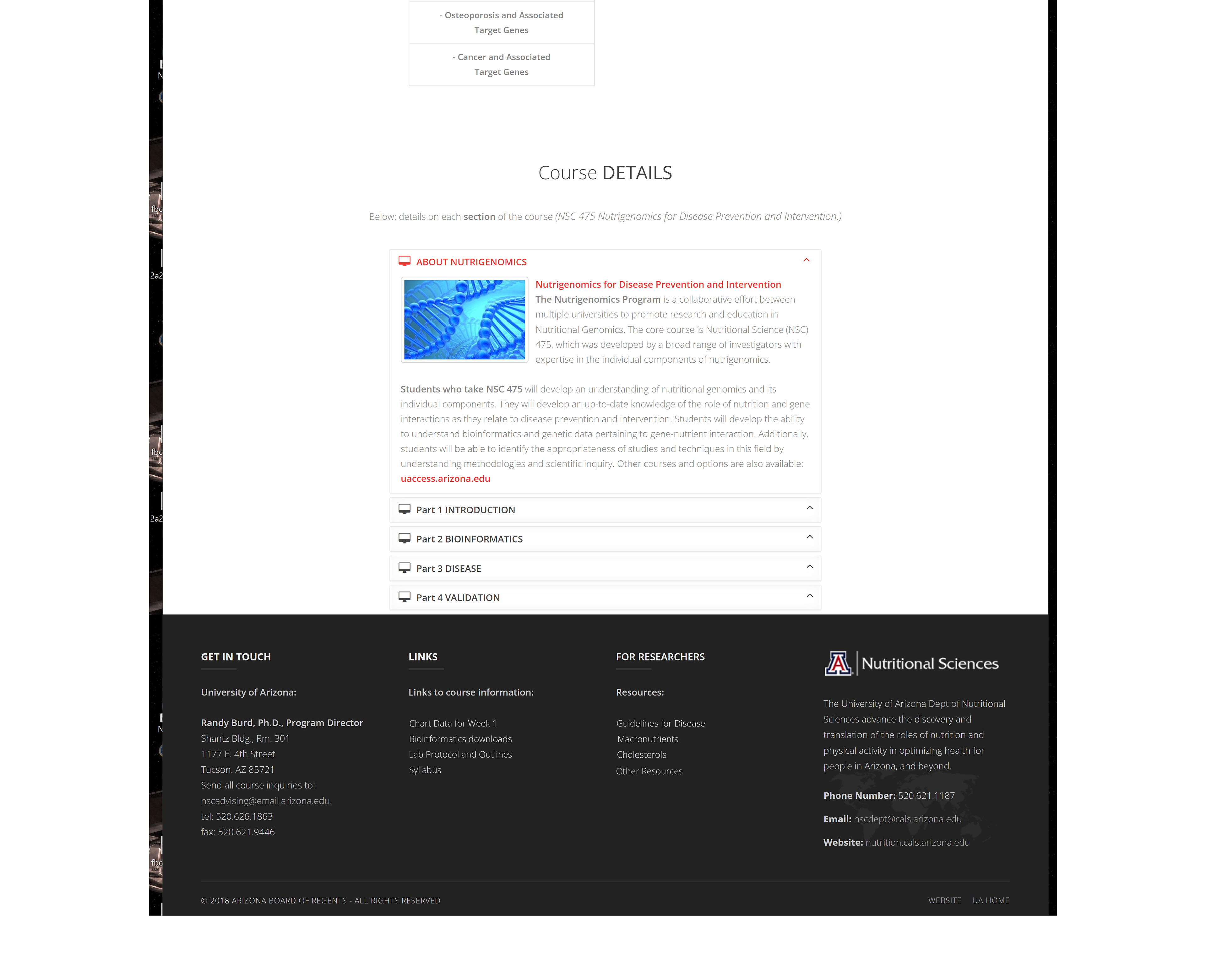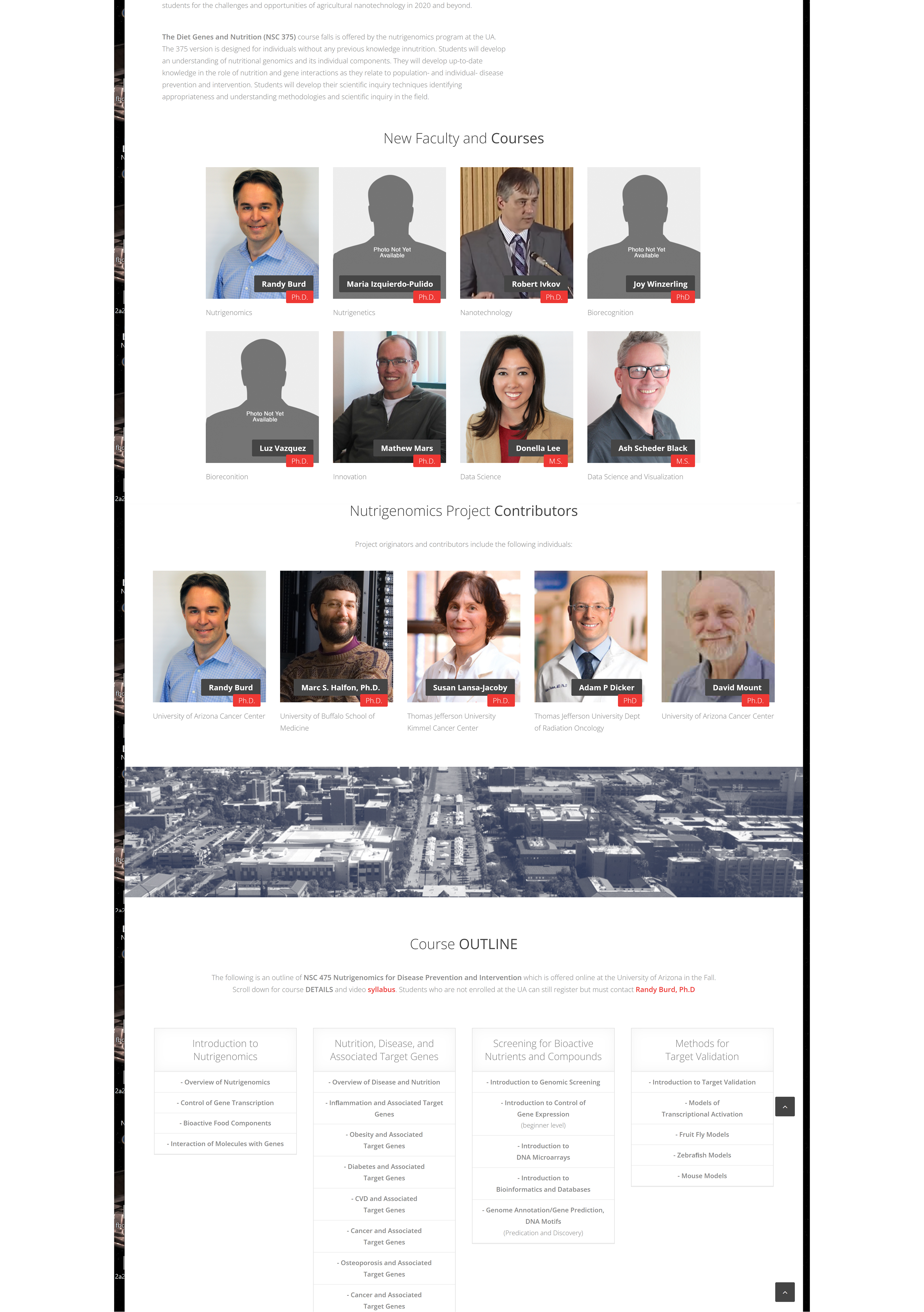 Project Investigator Dr. Randy Burd and I worked together to produce this website as a static syllabus for the students in his Nutrigenomics course as a way to track assignments. The goal was to develop and attractive and easily used single-page scrolling site as a detailed outline for the class.